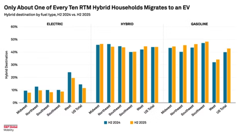 Overall, EV owners grab another EV when they go to market, although the number that did drop in the second half of 2025, even with the large number of EV purchases pulled forward. Where did those buyers go? About 10% went to hybrids, although a bigger and growing chunk ended up in a gas-powered vehicle.